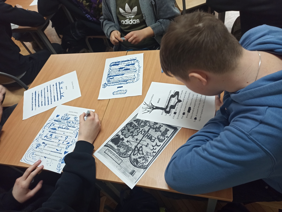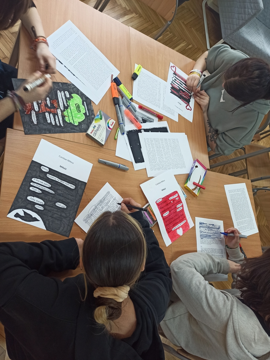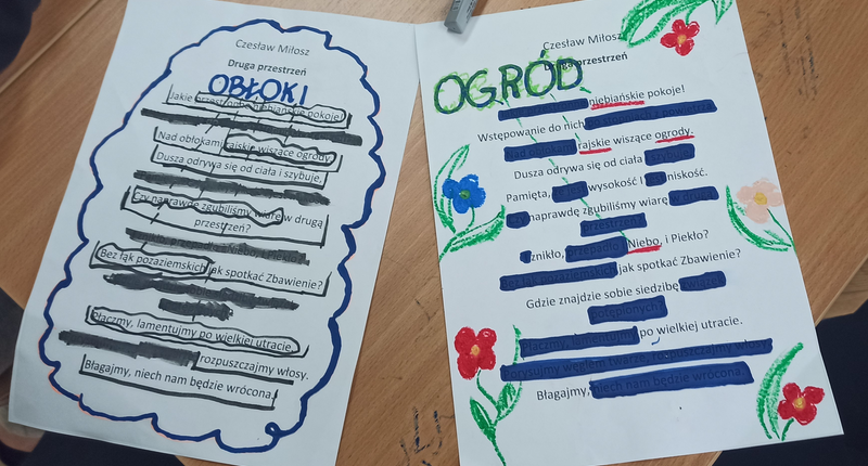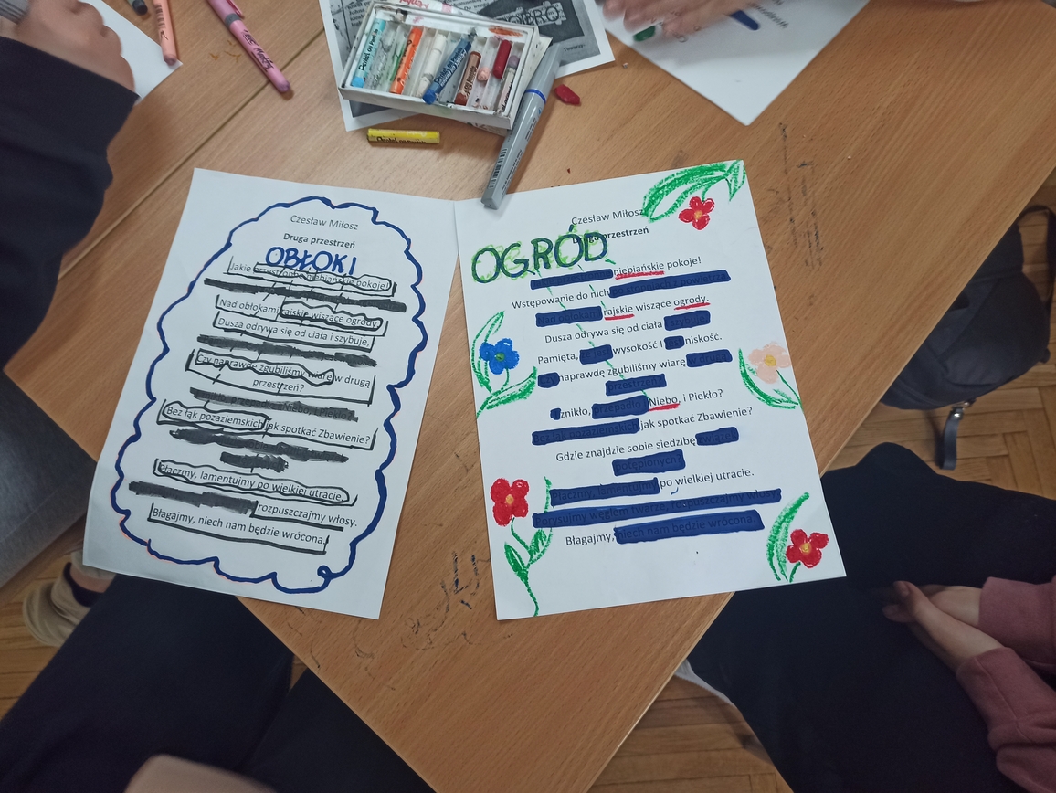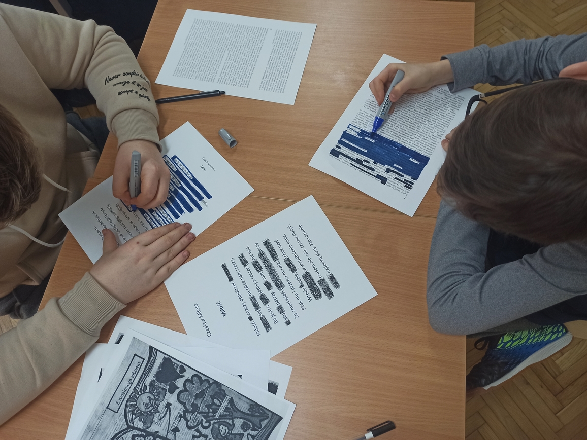 Uczniowie musieli skupić się na słowie, uważnie przeczytać fragment tekstu, zastanowić się, co ich zdaniem jest najciekawsze, czy najważniejsze, jak zestawiając słowa stworzyć nową jakość. Pracowali z twórczością Czesława Miłosza, Patrona 2024 Roku, odkrywając ją i nadając jej własne znaczenie. Wykazali się kreatywnością i talentem plastycznym przy tworzeniu unikatowych tekstów, ponieważ każdy, bez względu na umiejętności, może zostać poetą. Taka praca ze słowem pisanym rozwija świadomość literacką, uczy uważnego patrzenia na słowa i abstrakcyjnego myślenia. W warsztatach literackich uczestniczyli uczniowie klas: 1LO, 1TP, 1TŻ A i 3TP.