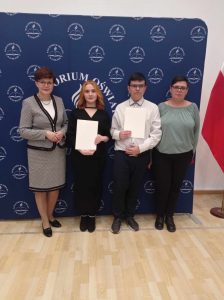 Mamy zaszczyt poinformować, że w dniu 16.11.2023r. w Urzędzie Wojewódzkim w Lublinie, nasi uczniowie Xeniya Dubinskaya z klasy IV TŻ i Szymon Zięba z klasy IV LO otrzymali Dyplomy Stypendysty Prezesa Rady Ministrów. Gratulujemy!