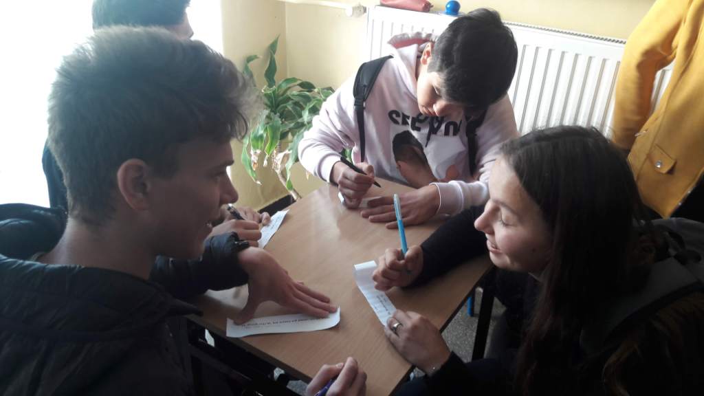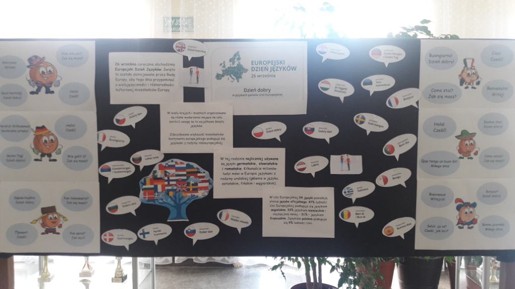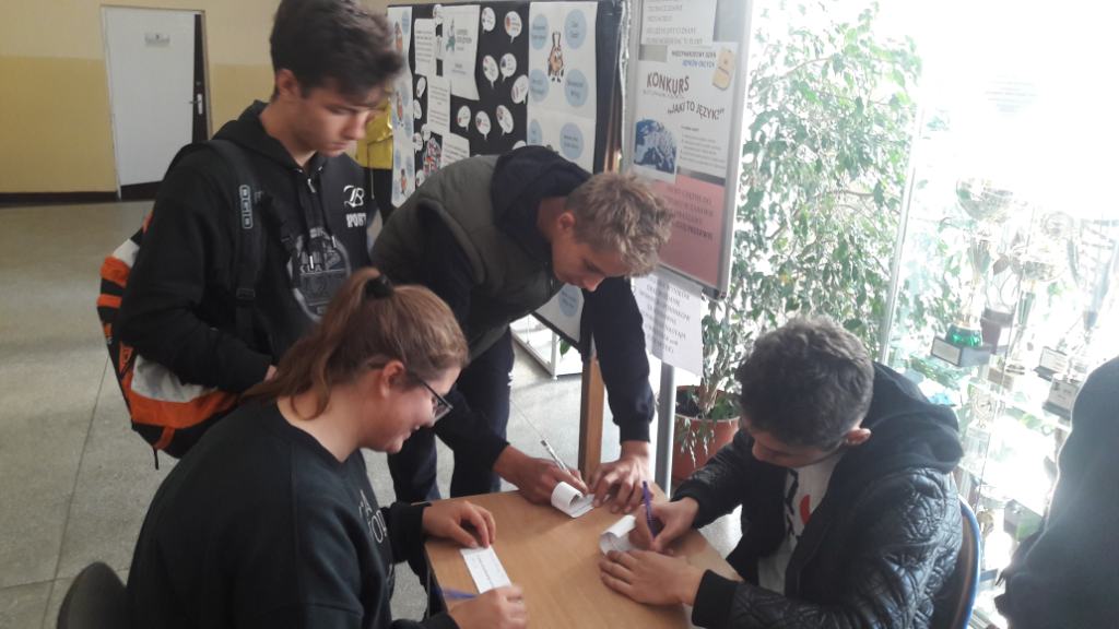 Z tej okazji na długiej przerwie odbył się konkurs pt. „Jaki to język?”. Uczniowie losowali kartki ze zdaniami w różnych językach europejskich. Ich zadaniem było odgadnąć, w jakim języku jest owe zdanie oraz przetłumaczyć je na j.polski.