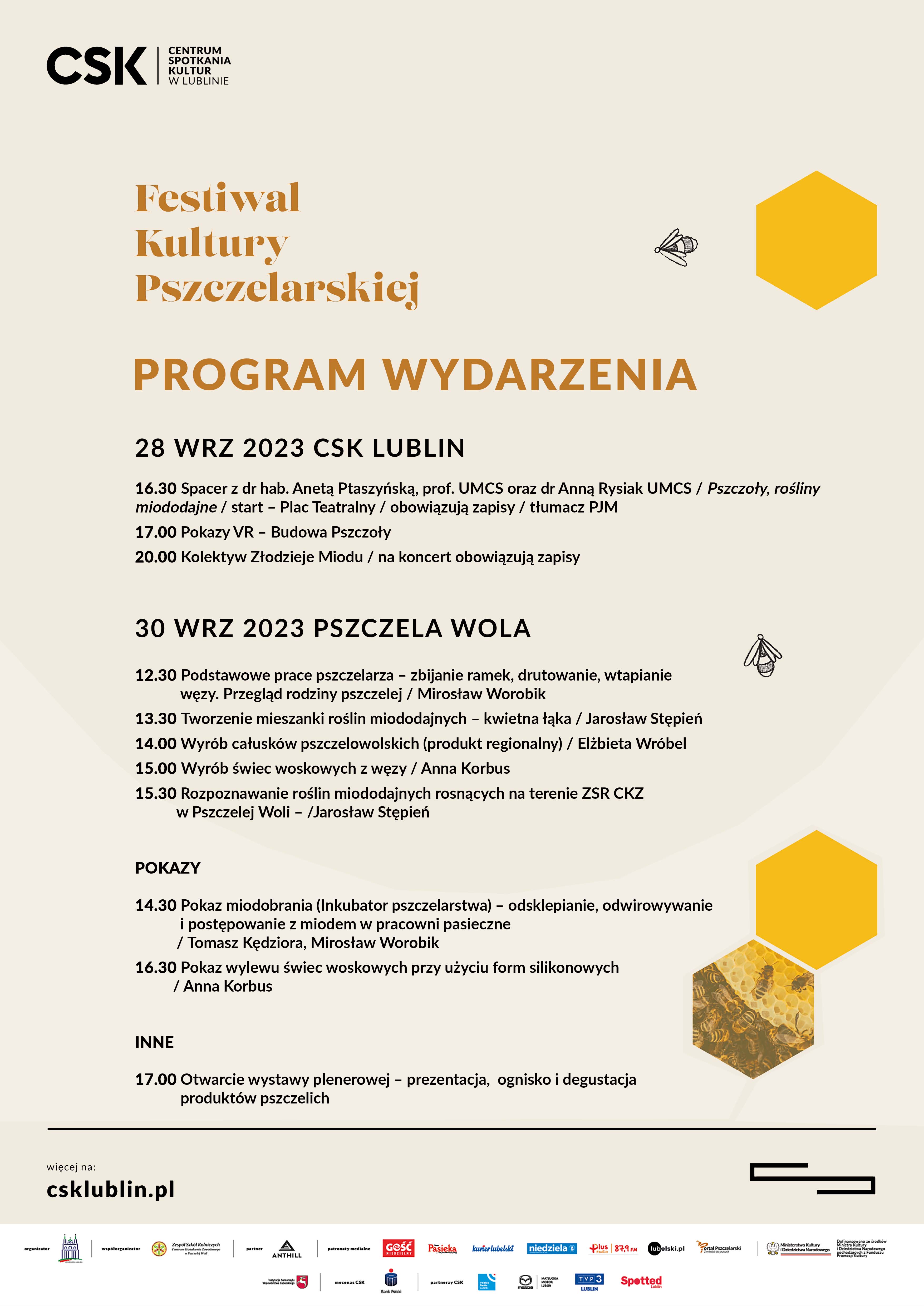 Festiwal Kultury Pszczelarskiej to nowe wydarzenie organizowane wspólnie przez Archidiecezję Lubelską oraz Centrum Spotkania Kultur w Lublinie. Pierwsza edycja Festiwalu, dzięki wsparciu Ministerstwa Kultury i Dziedzictwa Narodowego odbędzie się jesienią w 2023 roku. Festiwal nawiązuje do tożsamości regionu lubelskiego, historycznie i współcześnie wykazującego silne zakorzenienie w kulturze i codzienności wsi. Głównym celem Festiwalu jest prezentacja w sposób wielowymiarowy i interaktywny historii pszczelarstwa od czasów pierwotnych gospodarek pasiecznych do współczesnych inicjatyw w obrębie zrównoważonego rozwoju. Pierwsza edycja skupi uwagę odbiorców programu na dziedzictwie historyczno-kulturowym regionu lubelskiego – kolebki pszczelarstwa polskiego.