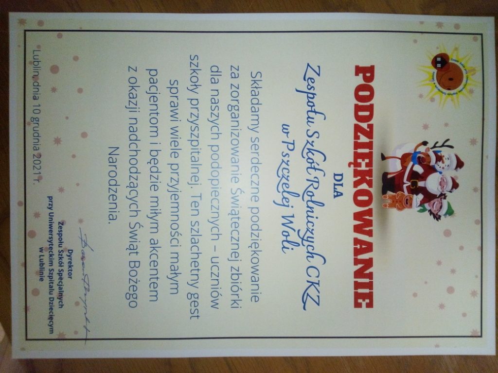 Miło nam poinformować, że zakończyliśmy akcję zbiórki słodyczy, materiałów szkolnych i zabawek przeznaczonych na prezenty dla dzieci, które w czasie Świąt będą musiały pozostać w szpitalu. Zebrane podarunki zostały zawiezione i przekazane pracownikom Zespołu Szkół Specjalnych przy Uniwersyteckim Szpitalu Dziecięcym w Lublinie. Tam zostaną sprawiedliwie podzielone i rozdane dzieciom.