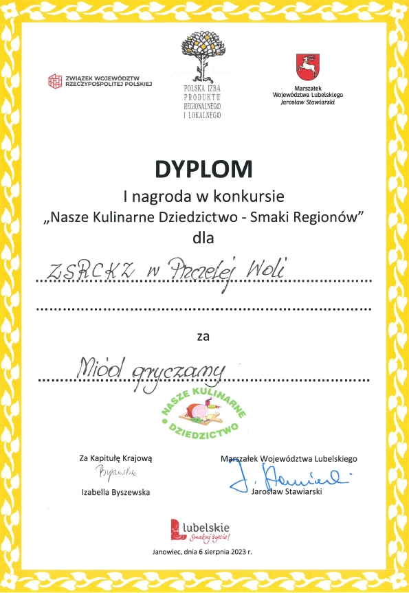Miło nam poinformować, że  w kategorii produktów regionalnych pochodzenia zwierzęcego w podkategorii miody, ZSR CKZ otrzymał I nagrodę za   miód gryczany