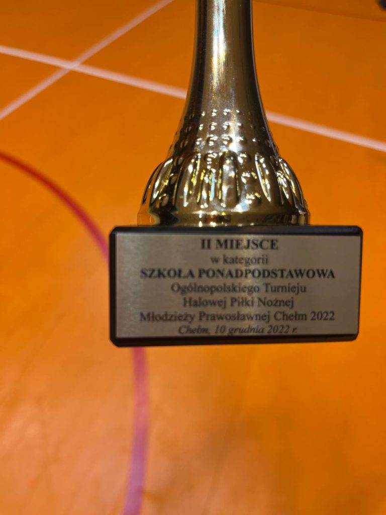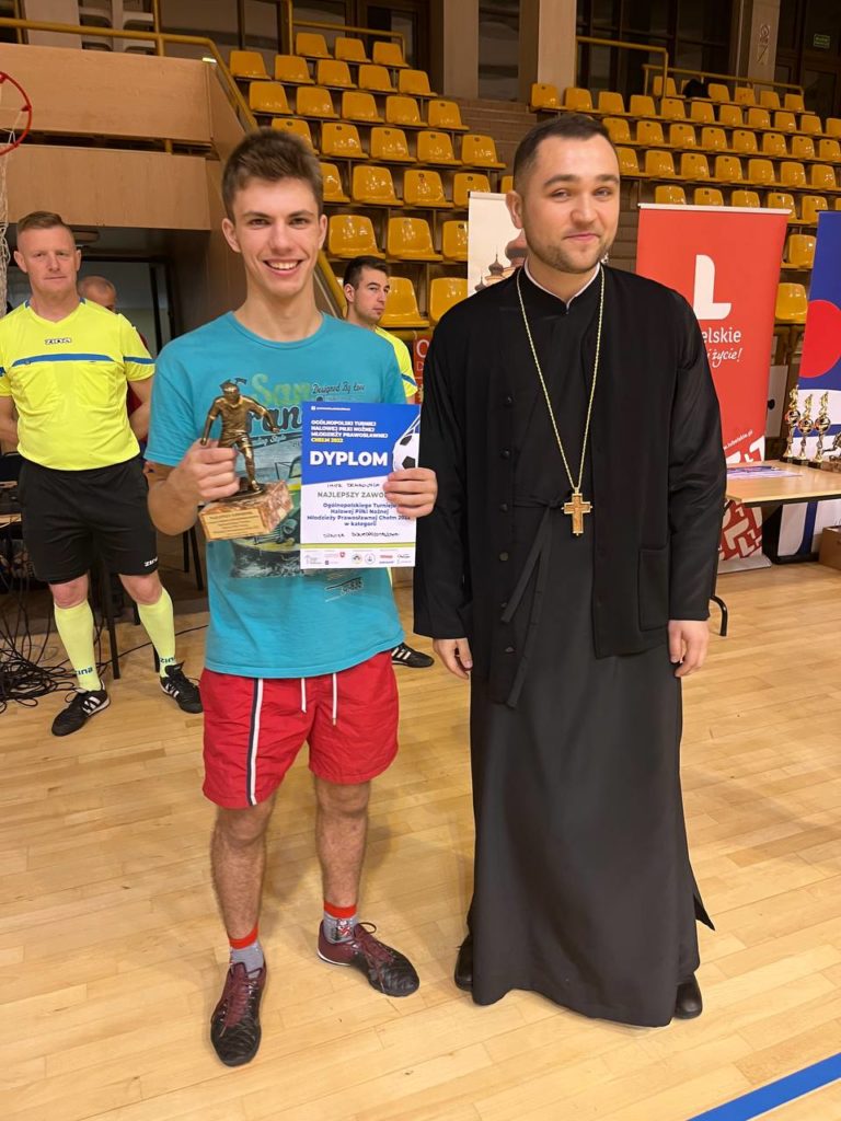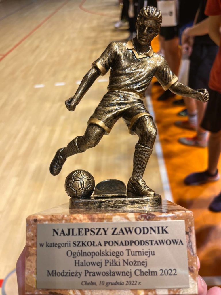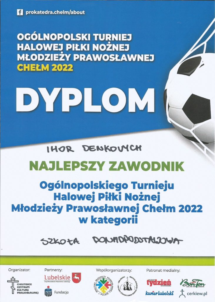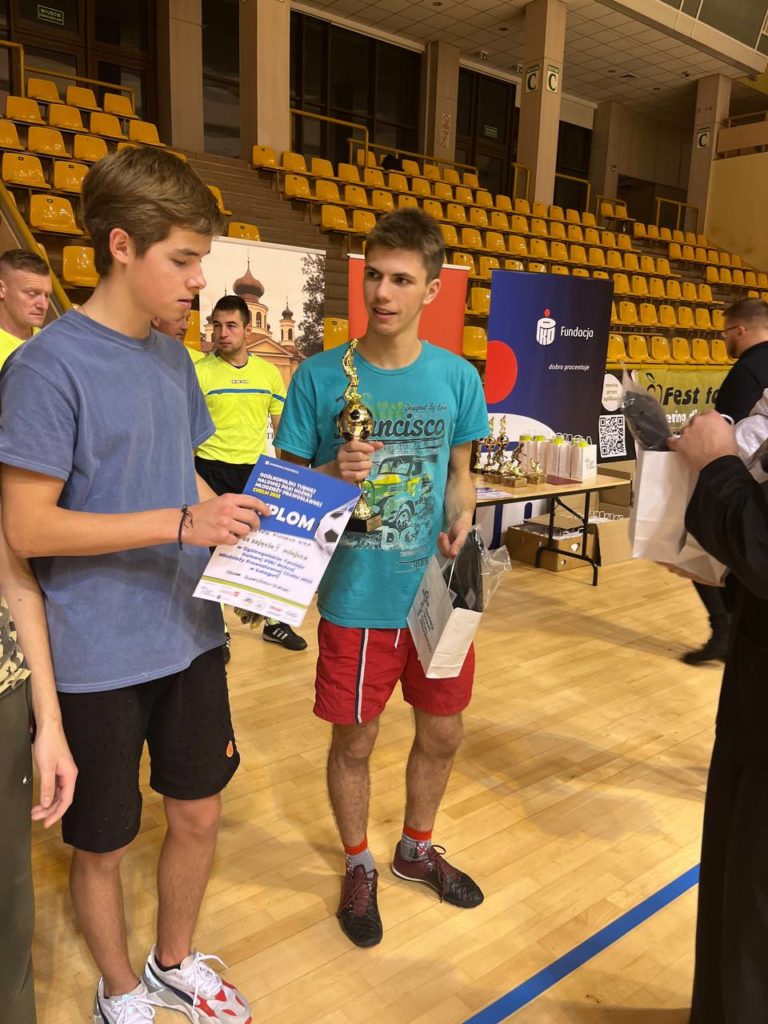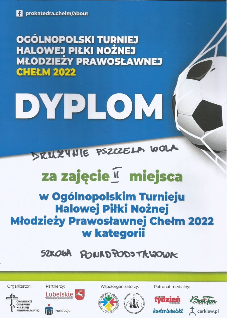 Nasza drużyna z Pszczelej Woli wywalczyła drugie miejsce w kategorii szkół ponadpodstawowych otrzymując dyplom i puchar, a kapitan zespołu IhorDenkovychpoprzez wręczanie dyplomu i okazjonalnej statuetki został wybrany najlepszym zawodnikiem swej kategorii.