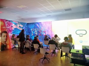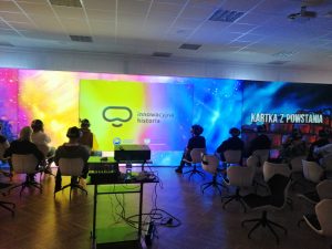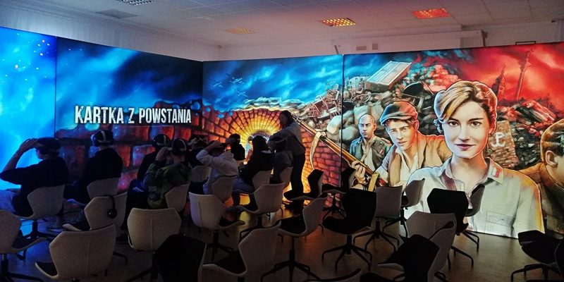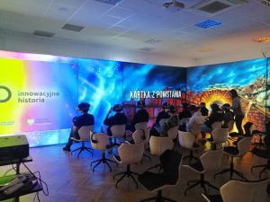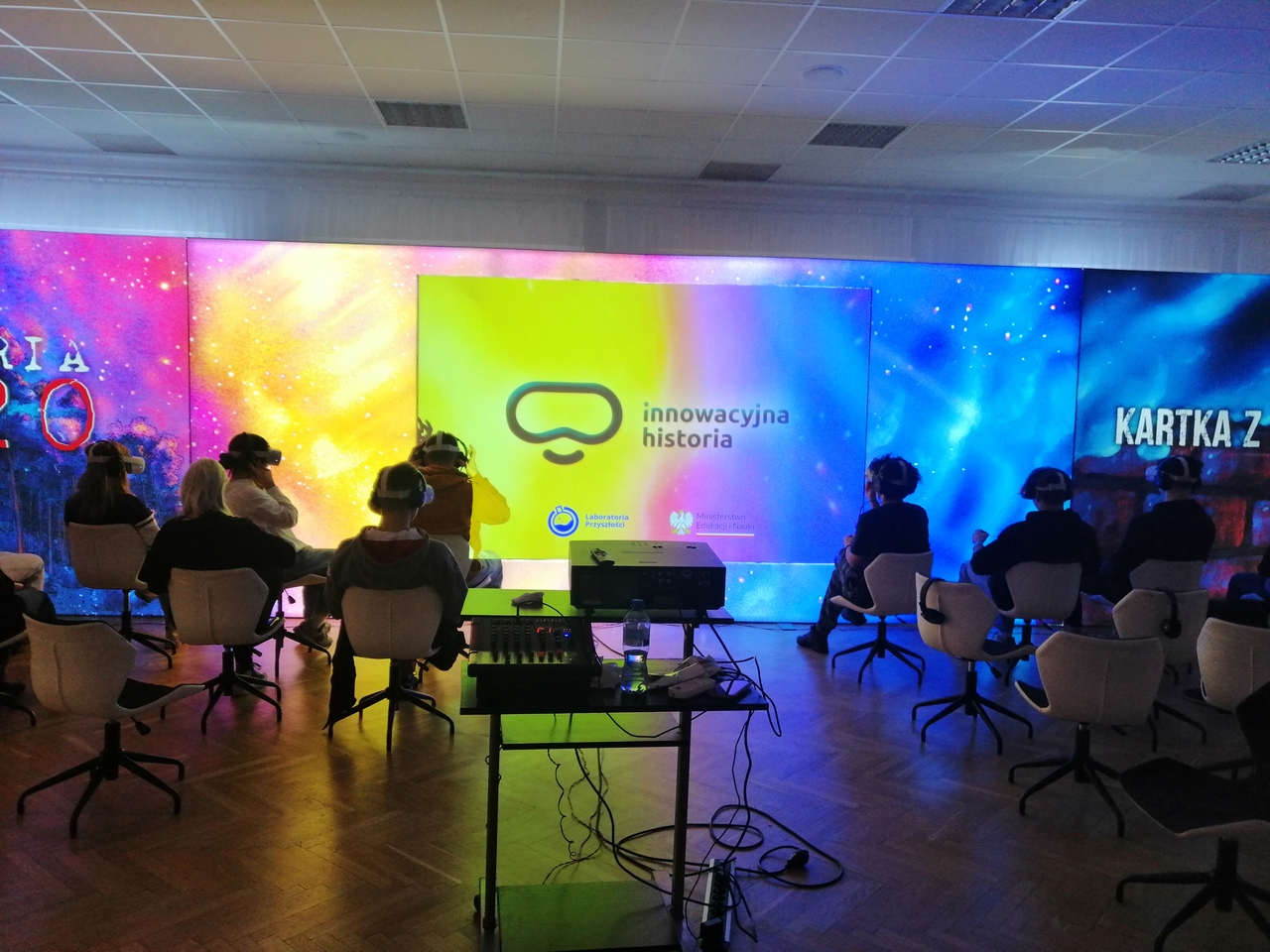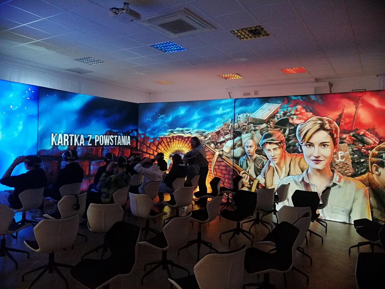 w internacie zamieniła się w salę kinową ze specjalną scenografią składającą się ze ścianek wydzielających przestrzeń, projektora, nagłośnienia oraz 70 obrotowych foteli dedykowanych doświadczeniu wirtualnej rzeczywistości. Wszystko to było przystosowane do pokazu  obejmującego projekcję dwóch filmów historycznych: „Kartka z Powstania” (Powstanie Warszawskie) oraz „Wiktoria 1920” (wojna polsko-bolszewicka). Oba seanse odbywały się w technologii wirtualnej rzeczywistości. Każdy uczestnik za pomocą  gogli VR czuł się jak jeden z bohaterów filmu. Wywarło to ogromne wrażenie i pozytywne emocje wśród uczniów. Czekamy na kolejną edycję programu.