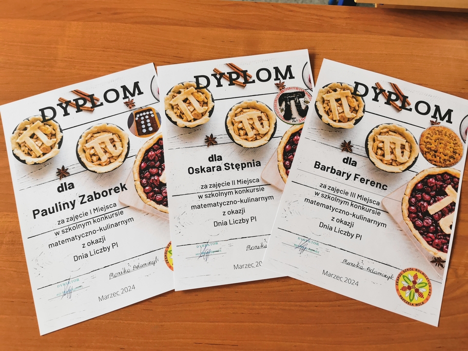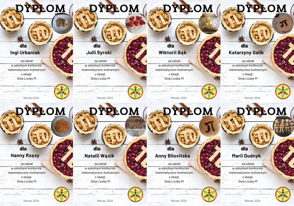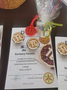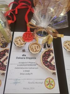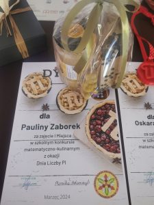 Z okazji Dnia Liczby Pi w naszej szkole został zorganizowany szkolny konkurs matematyczno-kulinarny. Uczniowie mieli za zadanie przygotować potrawę z symbolem liczby Pi. W tegorocznej edycji konkursu wzięło udział 11 uczniów. Najefektowniejsze potrawy wybrano poprzez głosowanie on-line. Pierwsze miejsce zajęła Paulina z klasy IVTŻ, drugie Oskar z I TŻ a trzecie miejsce zajęła Barbara z klasy II LO. Podsumowanie konkursu nastąpiło 26 kwietnia 2024 roku podczas akademii.