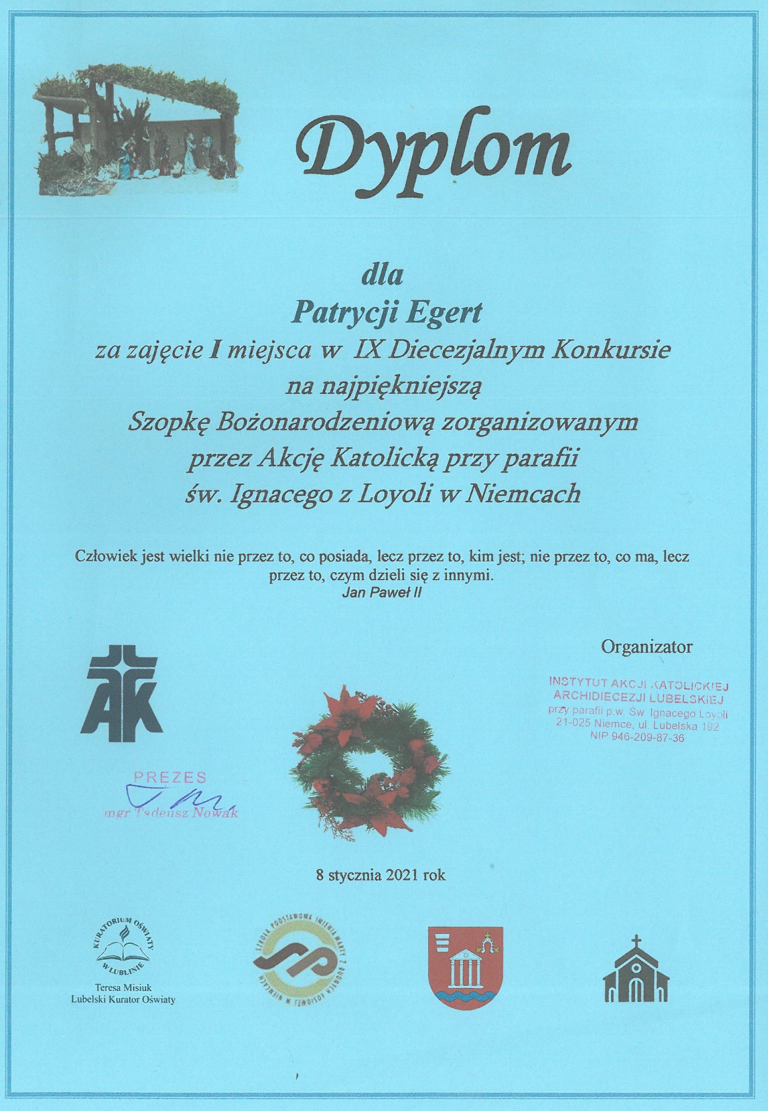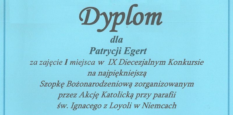Tradycyjnie już uczniowie naszej szkoły wzięli udział w IX Diecezjalnym Konkursie na najpiękniejszą szopkę bożonarodzeniową. Miło nam poinformować, że uczennica klasy III Liceum Ogólnokształcącego Patrycja Egert zajęła I miejsce.