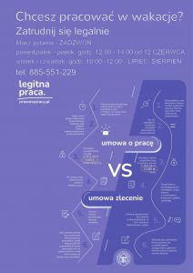 Informujemy, że w związku z trwającą kampanią informacyjno edukacyjną Państwowej Inspekcji Pracy „Legitna praca”, Okręgowy Inspektorat Pracy w Lublinie uruchomi – w okresie od 12 czerwca do 31 sierpnia 2023 r. – dyżur telefoniczny dla młodzieży chcącej podjąć pracę w wakacje. Młode osoby będą miały możliwość uzyskania bezpłatnej porady prawnej dotyczącej zasad legalnego zatrudnienia oraz informacji jakie prawa posiadają.