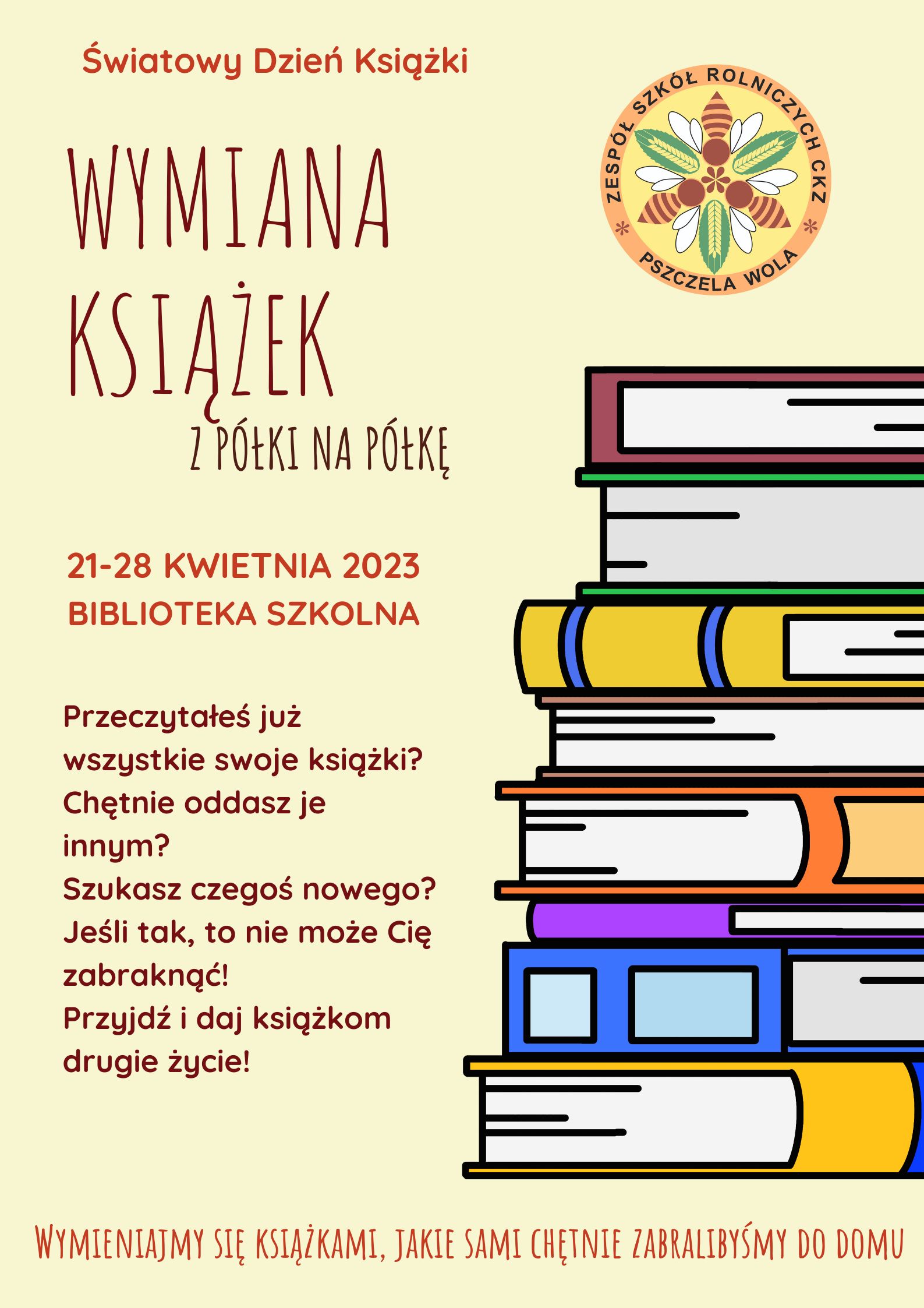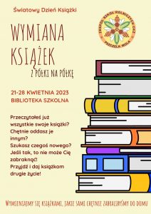 Wymiana rusza  21 kwietnia i  potrwa do 28 kwietnia. Nasza biblioteka organizuje ją w  ramach obchodów Światowego Dnia Książki i Praw Autorskich przypadającego 23 kwietnia.