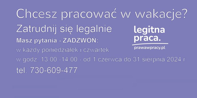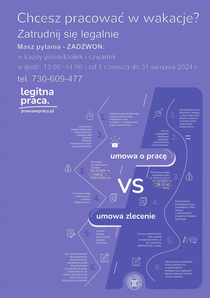 W związku z trwającą kampanią informacyjno-edukacyjną Państwowej Inspekcji Pracy „Legitna praca”, Okręgowy Inspektorat Pracy w Lublinie uruchomi – w każdy poniedziałek i czwartek w godzinach 13.00 – 14.00 w okresie od 1 czerwca do 31 sierpnia 2024 r. dyżur telefoniczny dla młodzieży chcącej podjąć pracę w wakacje. Młode osoby będą miały możliwość uzyskania bezpłatnej porady prawnej dotyczącej zasad legalnego zatrudnienia oraz informacji jakie prawa posiadają. Szczegóły na plakacie.