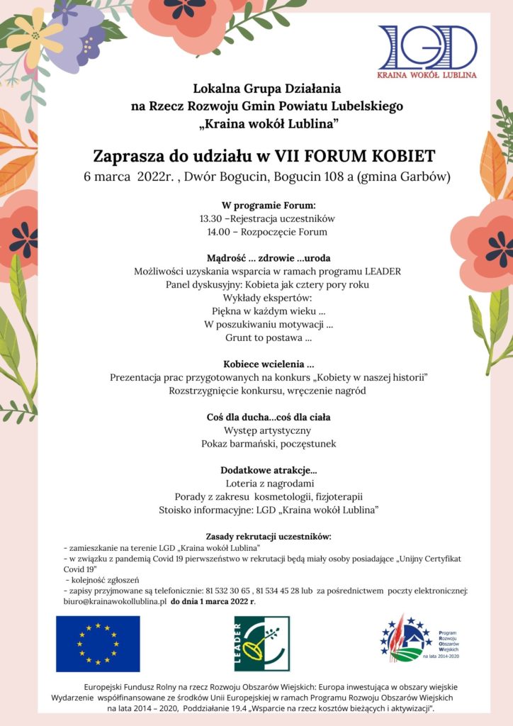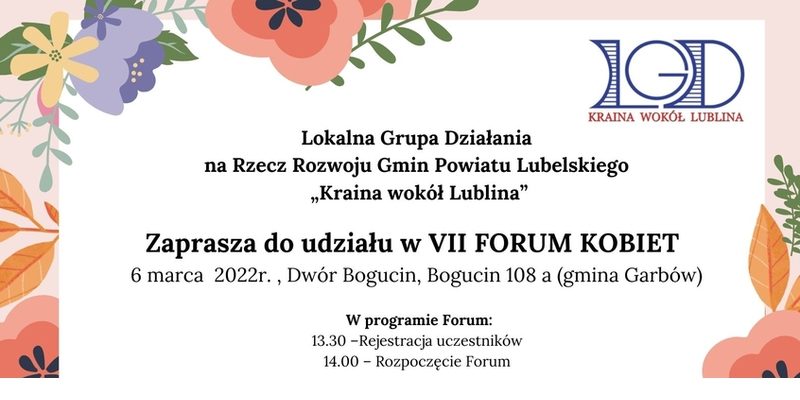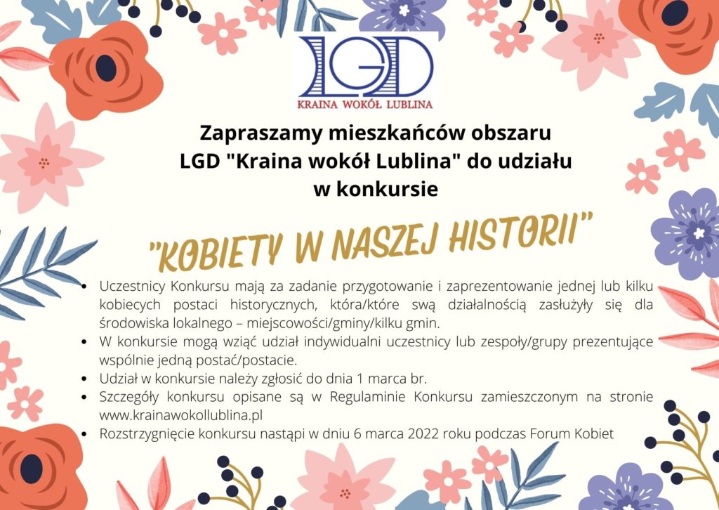 Lokalna Grupa Działania na Rzecz Rozwoju Gmin Powiatu Lubelskiego „Kraina wokół Lublina” serdecznie zaprasza do udziału w VII Forum Kobiet. Zachęcamy również do udziału w ogłoszonym konkursie ”Kobiety w naszej historii”.