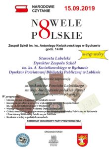 „Narodowe Czytanie 2019” w Zespole Szkół im. ks. Antoniego Kwiatkowskiego w Bychawie – 15 września 2019 roku o godzinie 14:00.