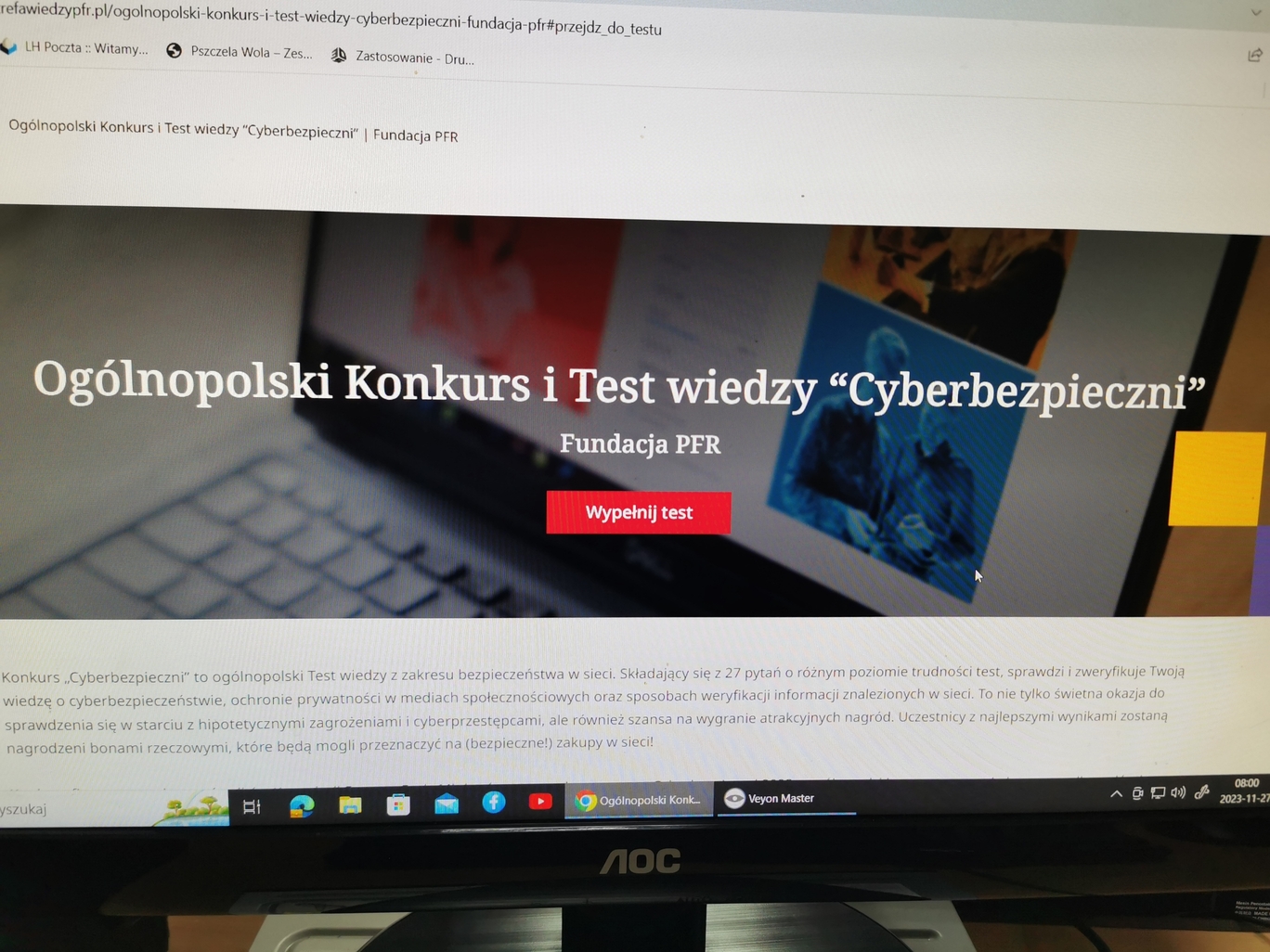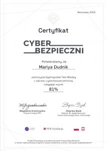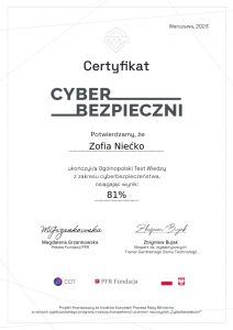 Uczniowie klas pierwszych, drugich i trzecich wzięli udziału w Ogólnopolskim Konkursie i Teście wiedzy „Cyberbezpieczni”. Konkurs miał formę testu składającego się z 27 zamkniętych pytań jednokrotnego wyboru, które podzielone są na trzy kategorie tematyczne i trzy poziomy trudności.