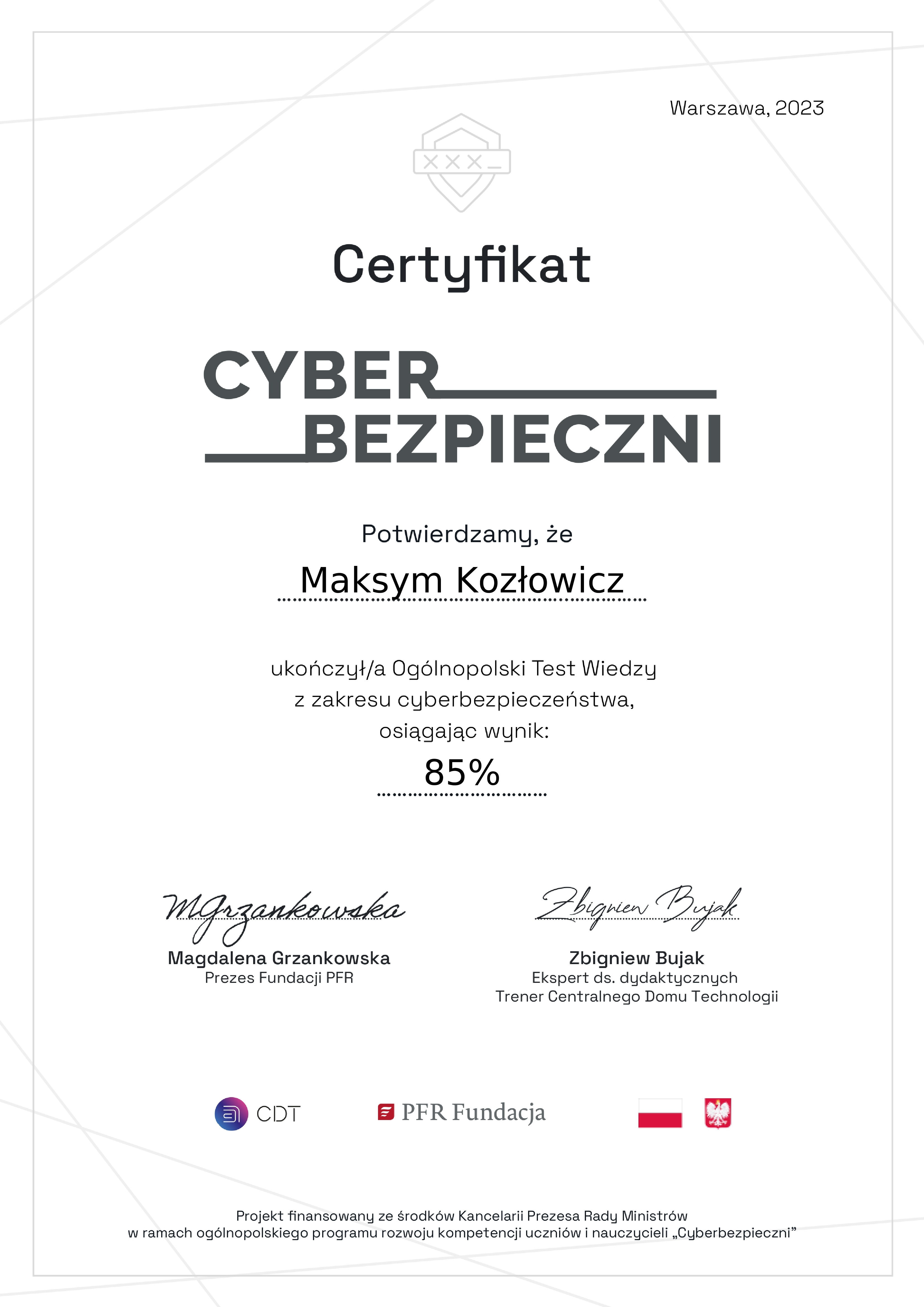 Udział w Konkursie gwarantuje zdobycie wiedzy i umiejętności w obszarze ochrony przed oszustwami internetowymi oraz rozpoznawania fake newsów i fact-checkingu. Projekt jest finansowany ze środków Kancelarii Prezesa Rady Ministrów w ramach ogólnopolskiego programu rozwoju kompetencji uczniów i nauczycieli „Cyberbezpieczni”.