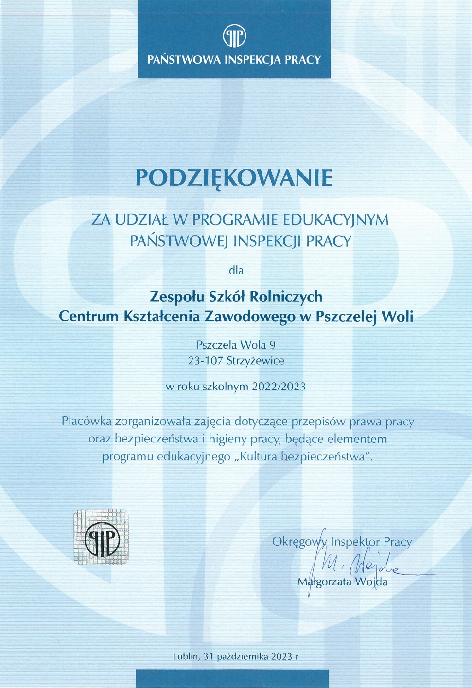 31 października 2023r. na terenie Targów Lublin, odbyło się uroczyste podsumowanie programu prewencyjnego „Kultura bezpieczeństwa” edycja 2022/2023 realizowanego we współpracy Państwowej Inspekcji Pracy ze szkołami ponadpodstawowymi. Celem programu jest propagowanie wśród uczniów niezbędnej wiedzy z zakresu prawa pracy.