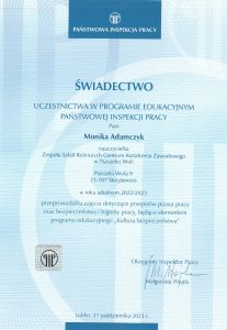 Spotkanie rozpoczęło się powitaniem gości oraz przemówieniem Okręgowego Inspektora Pracy Małgorzaty Wojdy, podczas którego zgromadzeni goście usłyszeli słowa uznania za czynny udział i ogromne zaangażowanie w realizację programu. Podczas spotkania wręczono podziękowania dla szkół oraz świadectwa nauczycielom biorącym udział w tegorocznej edycji programu. Naszą szkołę reprezentowała pani Monika Adamczyk.