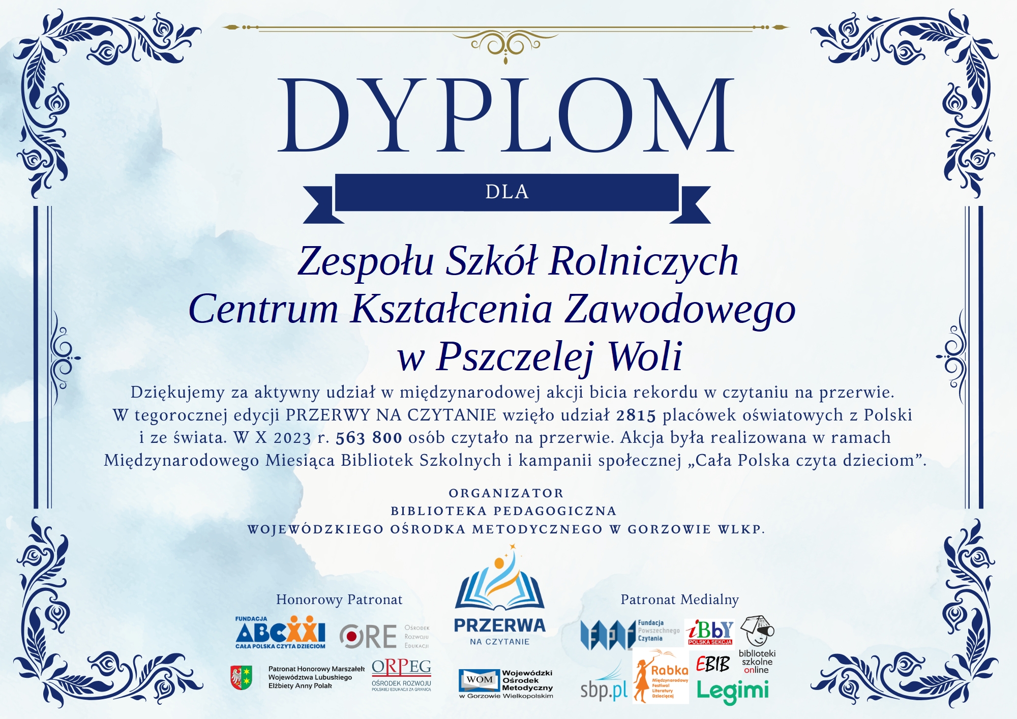 W tegorocznej międzynarodowej edycji bicia rekordu czytania wzięło udział 2982 placówki oświatowe z Polski i ze świata. W październiku 2023 roku na przerwie czytało 563 800 osób. Akcja była realizowana w ramach Międzynarodowego Miesiąca Bibliotek Szkolnych i kampanii społecznej „Cała Polska czyta dzieciom”.