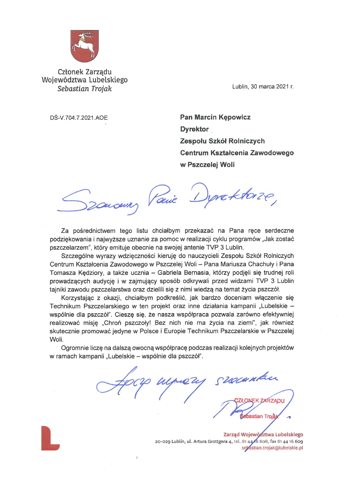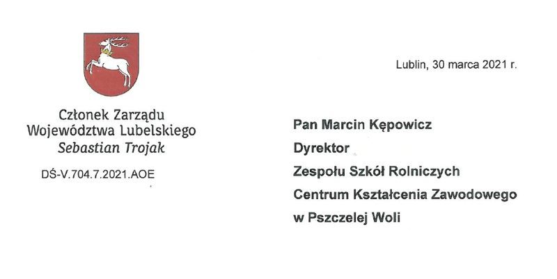 Podziękowania od Pana Sebastiana Trojaka Członka Zarządu Województwa Lubelskiego