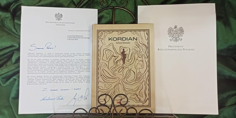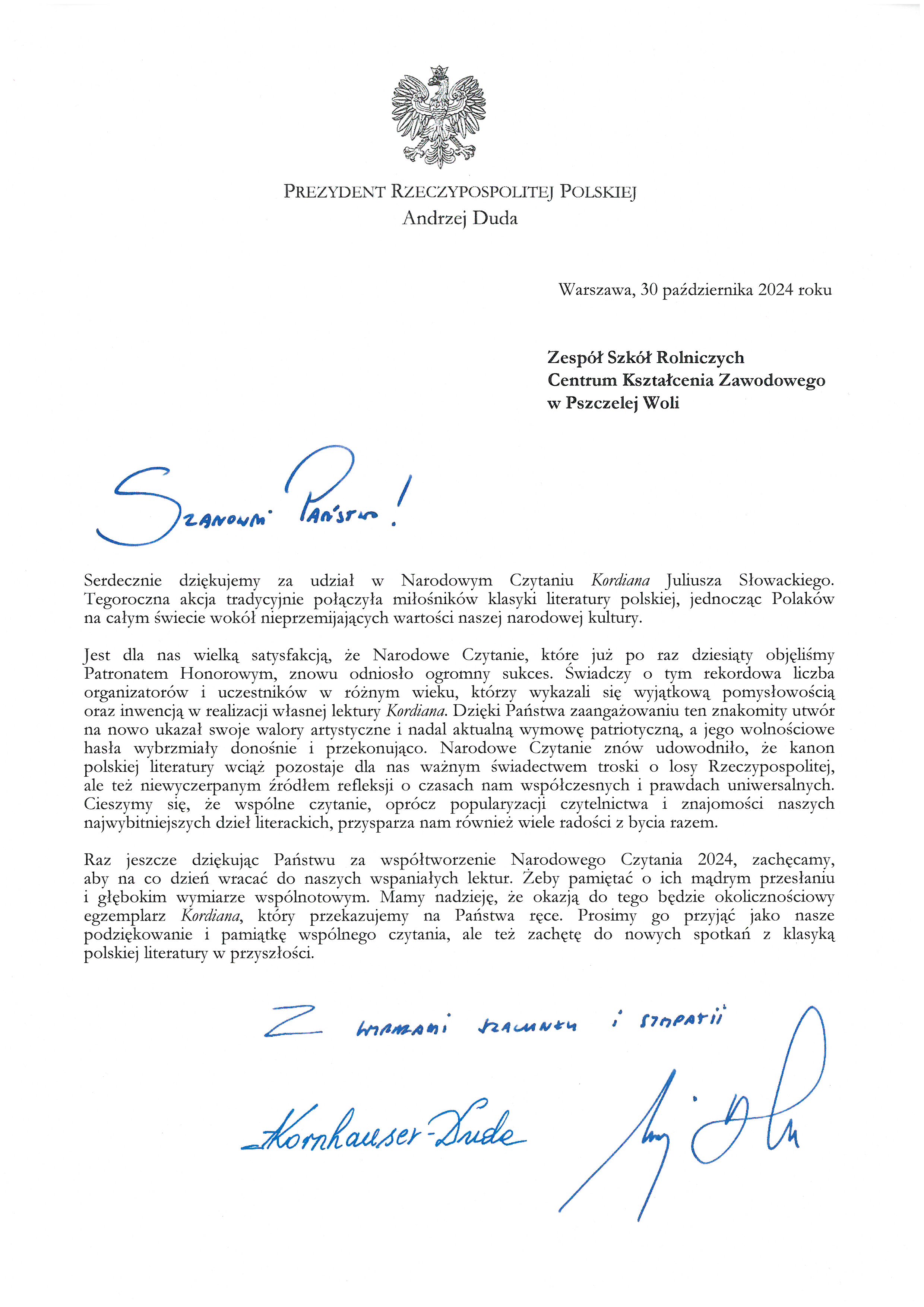 Miło nam poinformować, że  Zespół Szkół  Rolniczych Centrum Kształcenia Zawodowego w Pszczelej Woli otrzymał od Prezydenta Rzeczypospolitej Polskiej Andrzeja Dudy oficjalne podziękowanie za udział w 13. edycji Narodowego Czytania. Wraz z podziękowaniem otrzymaliśmy okolicznościowy egzemplarz „Kordiana” z pamiątkowym wpisem Pary Prezydenckiej.