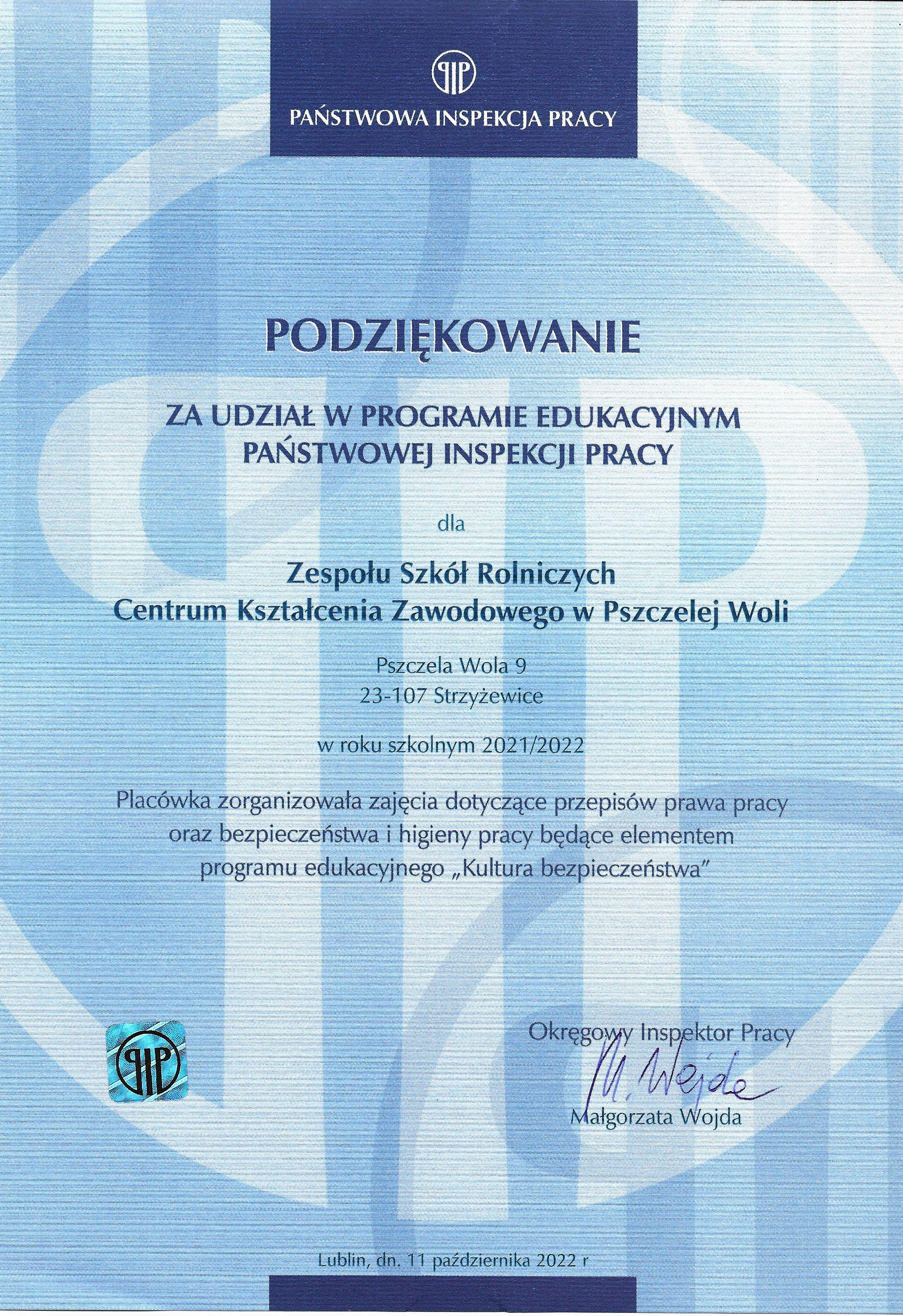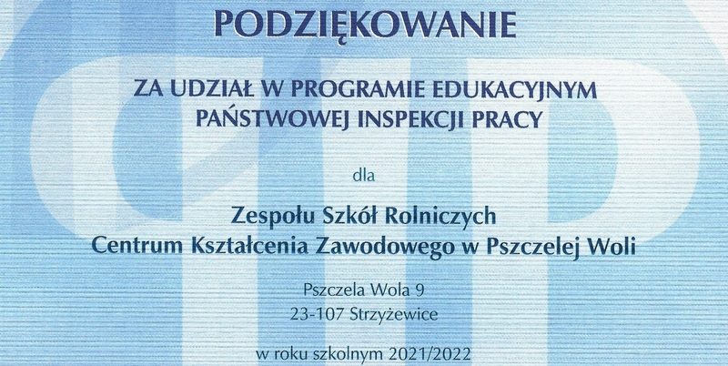 Podziękowanie za udział w projekcie „Kultura bezpieczeństwa”