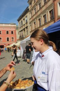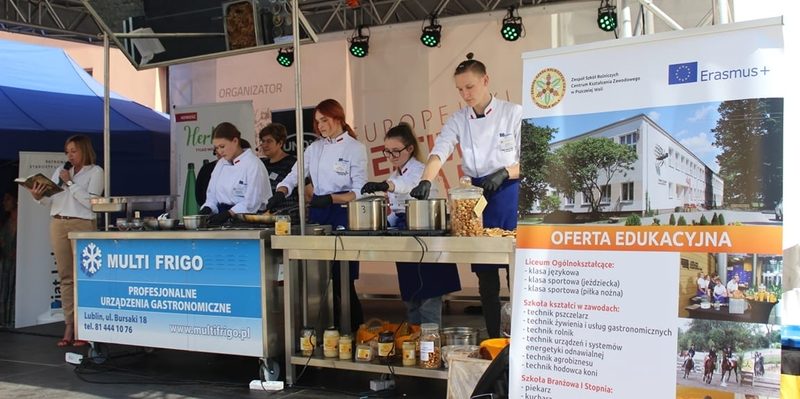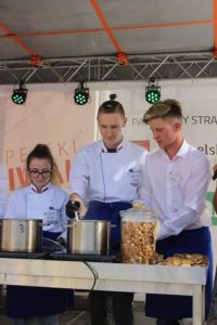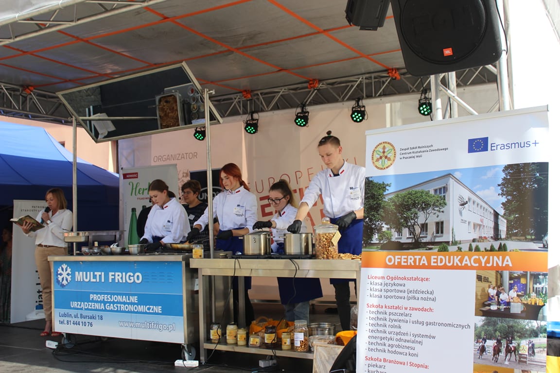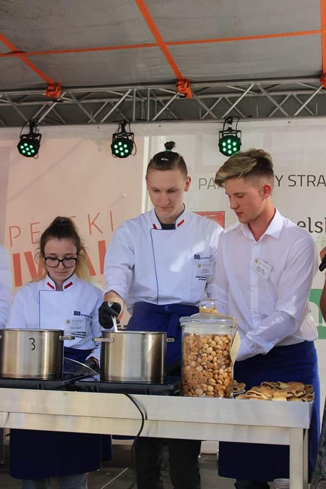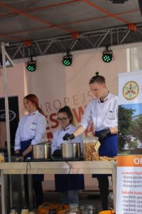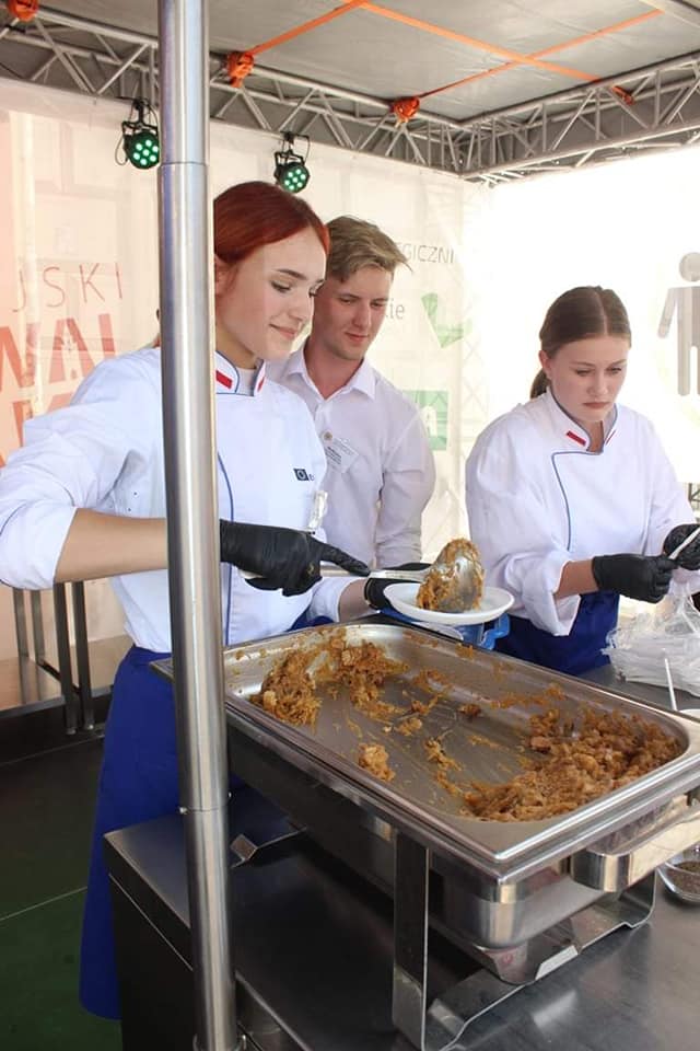 W sobotę 11.09.2021r. na Scenie Smaku odbył się pokaz – ,,Potrawy z Pana Tadeusza”. Wydarzenie kulinarne poprzedzone zostało odczytaniem fragmentów dzieła Adama Mickiewicza z opisem sporządzanych dań przez Panią Monikę Szabat – nauczyciela języka polskiego. Przyszli technicy żywienia wraz z nauczycielami – Anną Szcześniak i Teresą Chwałą – pokazali, że potrawy opisane w epopei narodowej mogą gościć na stołach i w dzisiejszych czasach. Odtworzone z opisów potrawy serwowane w Soplicowie: poranna kawa, bigos oraz barszcz na zakwasie zasmakowały uczestnikom Europejskiego Festiwalu Smaku.