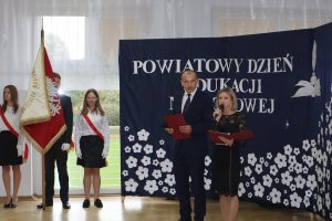 16 października 2023 roku w naszej szkole odbyły się Powiatowe obchody Dnia  Edukacji Narodowej. Uroczystość była okazją do wręczenia wyróżniającym się dyrektorom i nauczycielom Nagród Starosty, wręczono także akty nadania stopnia awansu zawodowego nauczyciela mianowanego, a uczniom stypendia edukacyjne. Stypendia Starosty są przyznawane za szczególne osiągnięcia naukowe, znakomite wyniki sportowe lub artystyczne.