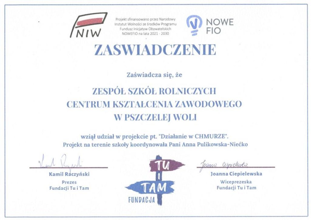 Miło nam poinformować, iż nasza szkoła zrealizowała kolejną kilkuetapową inicjatywę przy współpracy z Fundacją Tu i Tam. Projekt „Działanie w chmurze” skierowany do szkół ponadpodstawowych z województwa lubelskiego. Zrealizowaliśmy szkolenia i warsztaty dla 8 oddziałów w dwugodzinnych blokach.