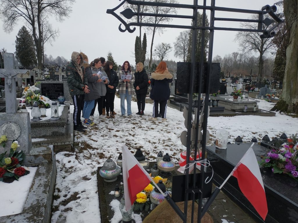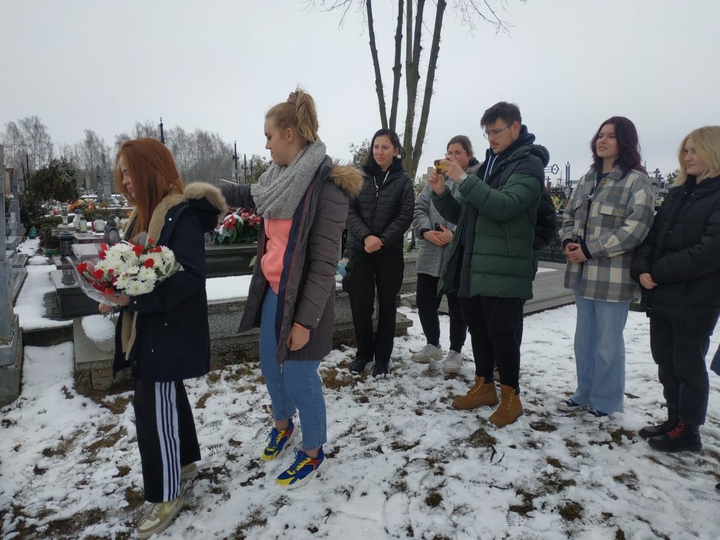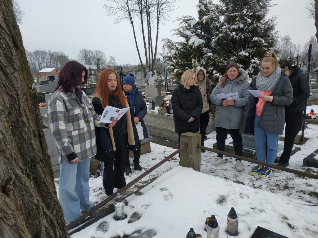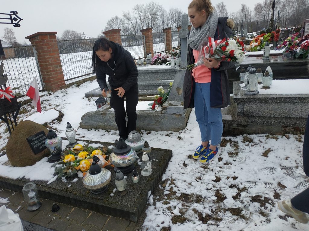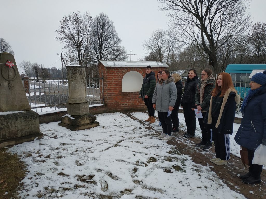 Młodzież naszego internatu zapoznała się z życiorysem Rotmistrza Romana Okulic-Kozaryna założyciela Ochotniczej Straży Pożarnej z 1916 r. i zakonspirowanego Oddziału Polskiej Organizacji Wojskowej. Szczególną uwagę zwrócono na symboliczną mogiłę nieznanego z imienia i nazwiska żołnierza „Powstania Polskiego” z 1863 roku. Ślady trudnej historii naszego narodu przetrwały także na grobach: Klamborowskiego i Gintowta uczestników między innymi wojen napoleońskich znajdujących się na przykościelnym cmentarzu. Wychowankowie złożyli kwiaty i zapalili znicze na grobach bohaterów. Nad brzmieniem pieśni i piosenek patriotycznych czuwała Karolina Wołoszyn – przewodnicząca Samorządu Uczniowskiego intonując pieśni z epoki.