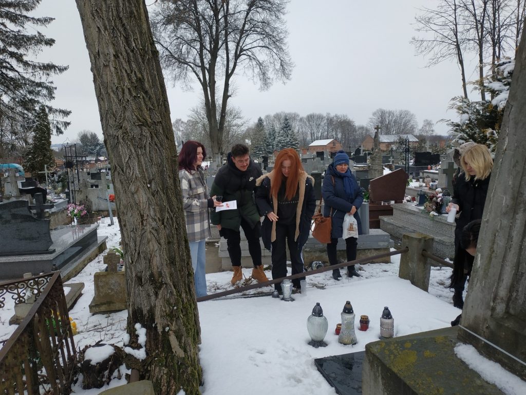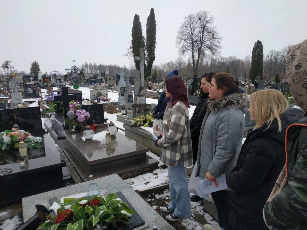 W drodze powrotnej uczniowie zapalili znicze na cmentarzu w Bystrzycy Starej na grobie śp. Eugenii Gąsior wieloletniej nauczycielki naszej szkoły. Znicze zapłonęły także przed tablicą pamiątkową pilota Jana Jakubowskiego, który zginął w 1943 roku w Anglii.