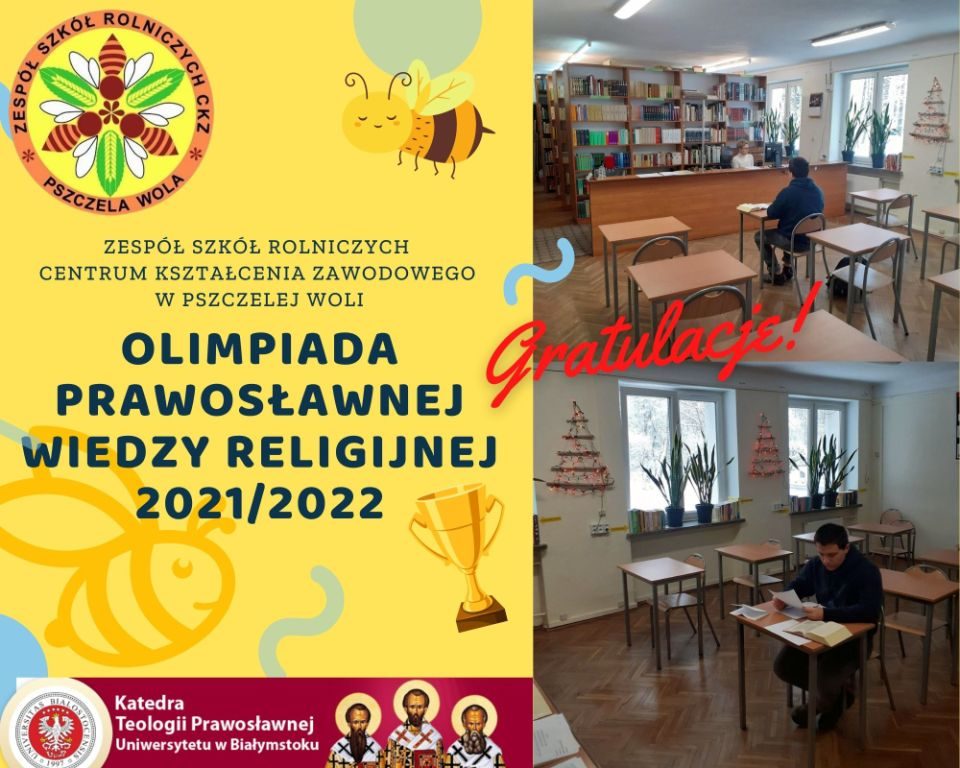 28 lutego br. w imieniu organizatora Olimpiady Prawosławnej Wiedzy Religijnej 2021/2022 – Katedry Teologii Prawosławnej Uniwersytetu w Białymstoku, Komitet Główny Olimpiady poinformował, iż uczeń klasy drugiej Technikum Pszczelarskiego – Mykola Masiuk został zakwalifikowany do trzeciego centralnego etapu Olimpiady, który jest zaplanowany na 17-18 marca br. w Białymstoku.