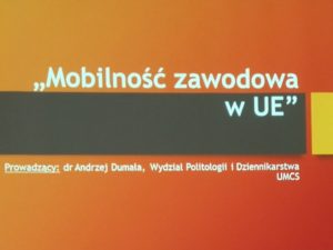 2) „Mobilność zawodowa w UE”, na którym uczniowie uzyskali wiedzę, umiejętności i kompetencje społeczne konieczne do wejścia i funkcjonowania na rynku pracy w UE oraz poznali zasoby UE wspierające zatrudnienie osób młodych.