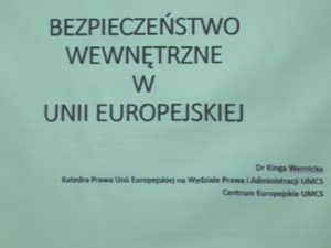 1) ”Bezpieczeństwo wewnętrzne w UE”, na których zapoznali się ze współpracą policyjną i sądową w sprawach karnych oraz poznali funkcjonowanie różnych agencji UE umożliwiających realizowanie tej współpracy. Na tych warsztatach uczniowie poznali sposoby zwalczania terroryzmu w UE oraz walki z przestępczością zorganizowaną obejmującą handel ludźmi i zapewnienia bezpieczeństwa związanego z funkcjonowaniem strefy Schengen.