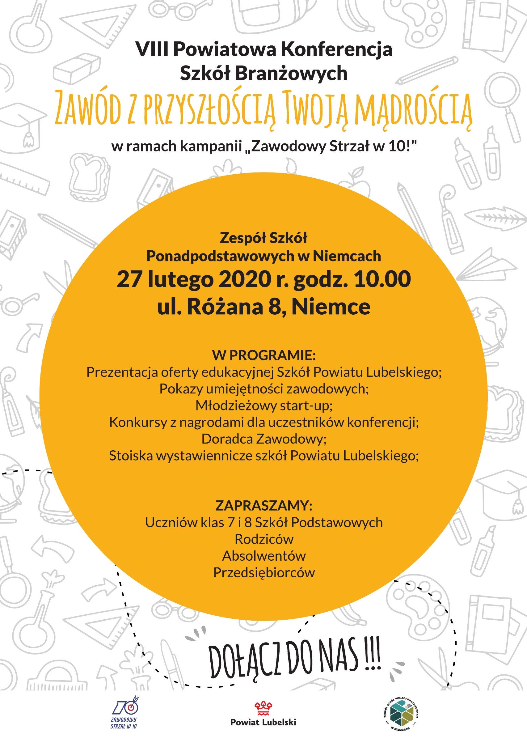 Zapraszamy uczniów klas VII i VIII szkoły podstawowej i ich rodziców na VIII Powiatową Konferencję Szkół Branżowych pn. ZAWÓD Z PRZYSZŁOŚCIĄ TWOJĄ MĄDROŚCIĄ w ramach kampanii „Zawodowy Strzał w 10!”, której celem jest prezentacja oferty edukacyjnej szkół ponadpodstawowych prowadzonych przez Powiat Lubelski.